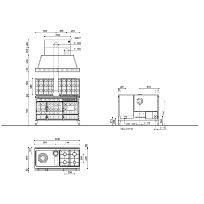 Cuisinière combinée à bois, à gaz, électrique, avec foyer, four à bois, four électrique multifonction, plaque de cuisson en fonte, table de cuisson personnalisable en acier inox.