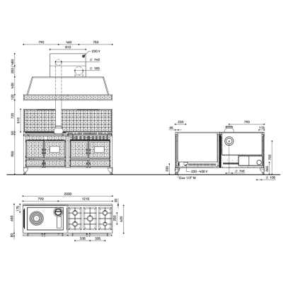 Cuisinière combinée à bois, à gaz, électrique, avec foyer, four à bois, four électrique statique, four électrique multifonction, plaque de cuisson en fonte, table de cuisson personnalisable en acier inox.
